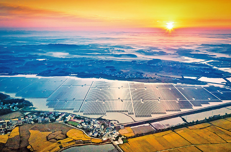 中國華能通過漁光互補、農(nóng)光互補、風電光伏一體化等方式,推動新能源發(fā)展與生態(tài)治理協(xié)同共進,助力鄉(xiāng)村振興。圖為位于江西省上饒市鄱陽縣的華能麻葉湖光伏電站。 中國華能供圖