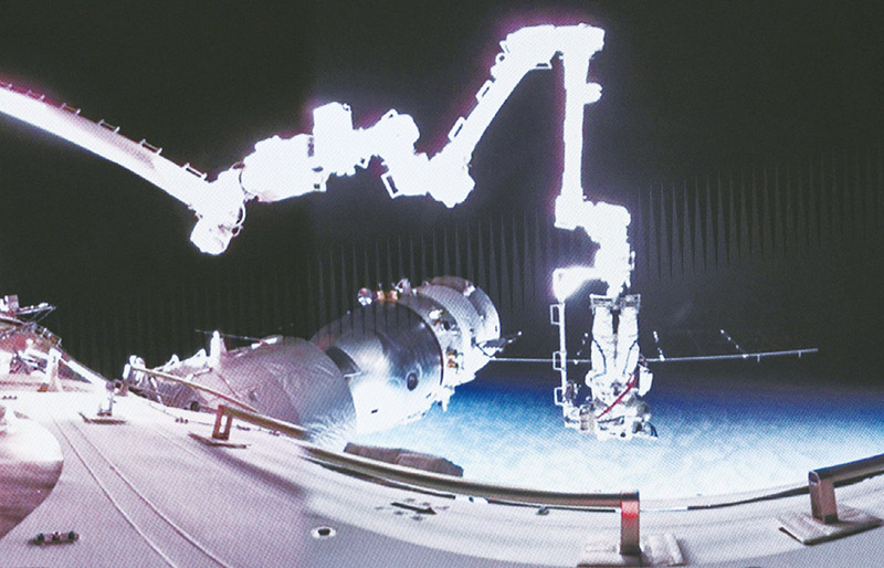 2024年3月2日,神舟十七號(hào)航天員乘組第二次出艙活動(dòng)取得圓滿成功,這是我國(guó)航天員首次完成在軌航天器艙外設(shè)施的維修任務(wù)。圖為在北京航天飛行控制中心拍攝的神舟十七號(hào)航天員江新林在空間站機(jī)械臂的輔助下進(jìn)行艙外作業(yè)。?新華社記者 李賀/攝
