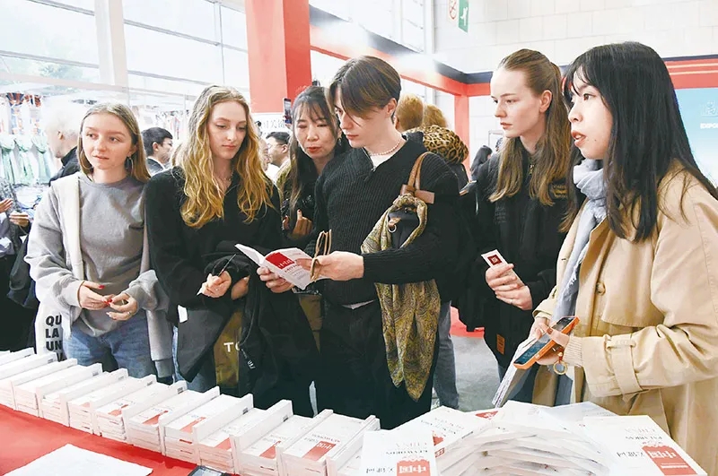 當(dāng)?shù)貢r間2023年4月27日,中國外文局在第117屆法國巴黎國際博覽會上舉辦“遇·鑒中國”中華文化主題展及系列文化交流活動。圖為中外青年在展覽現(xiàn)場關(guān)注“中國關(guān)鍵詞”全系列多語種主題圖書。?中新社記者 李洋/攝