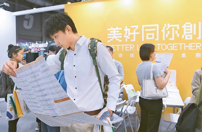 在粵港澳三地和有關(guān)部門有力推動下,大灣區(qū)建設(shè)熱潮澎湃,城市之間“互相奔赴”密集涌現(xiàn),創(chuàng)新驅(qū)動力不斷增強(qiáng)。圖為2023年11月4日,在“創(chuàng)新香港—國際人才嘉年華2023”上,一名求職者瀏覽華潤公司的招聘信息。新華社記者 陳鐸/攝